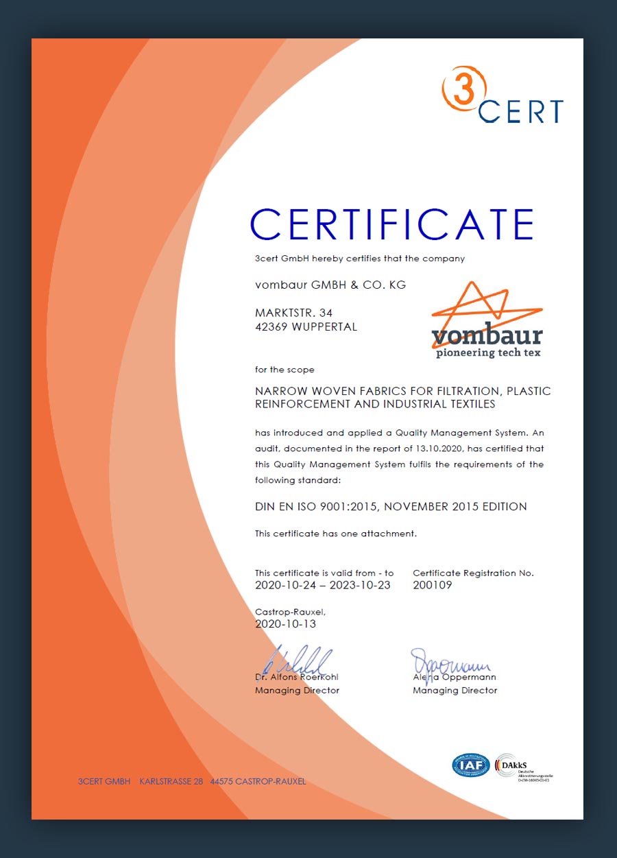 Quality assurance follows our strict quality management system: certified in line with DIN EN ISO 9001:2015, vombaur stands for quality – in all areas and at all levels. For your unique textile engineering solution. Perfect fit. Process assured. Seamless.